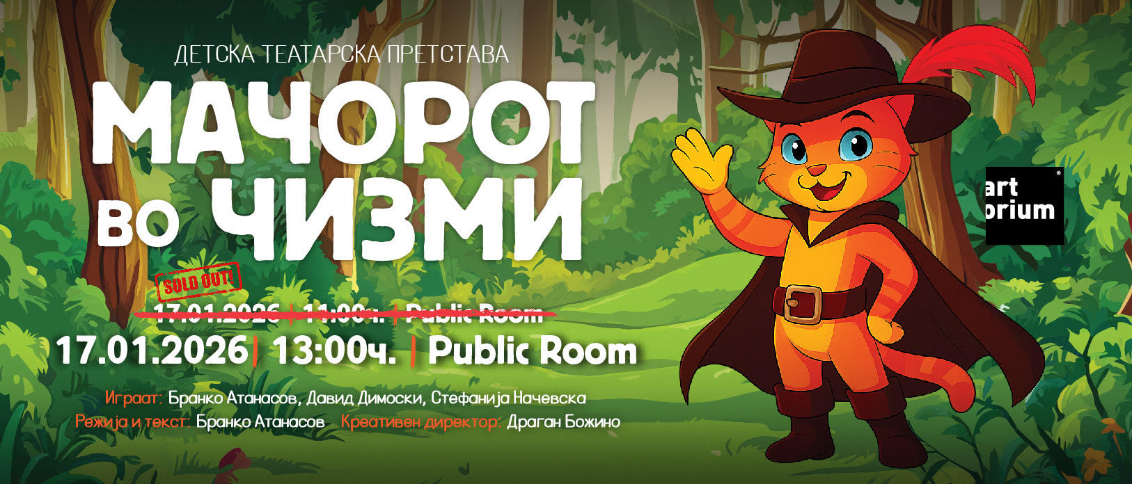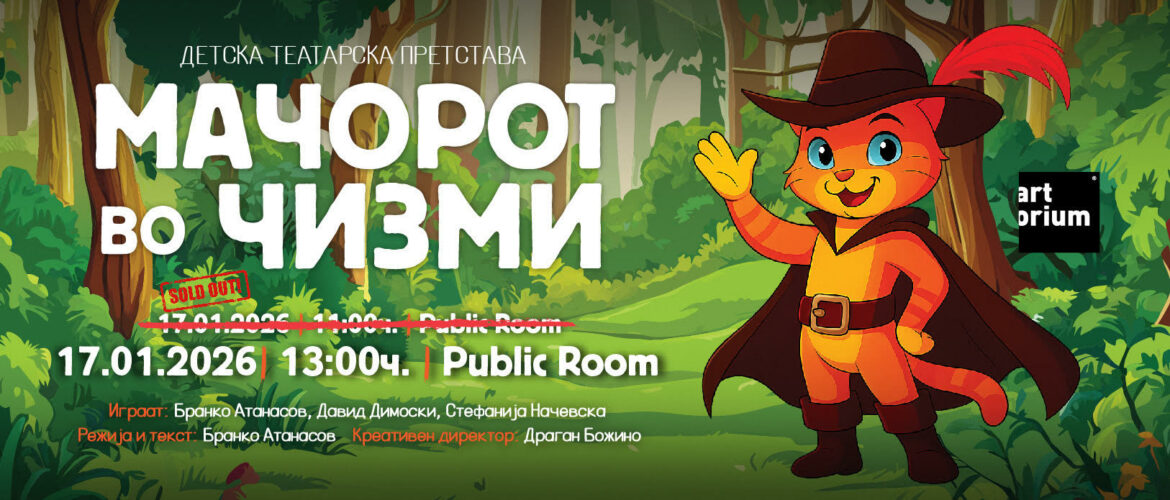2026та година ја започнуваме со највозбудливата, најинтересната и најбараната детска претстава ,,Мачорот во чизми”.