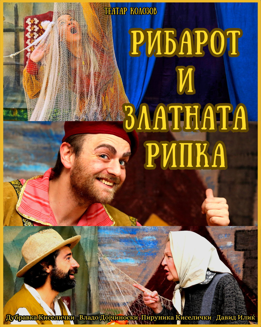 Реномиирани актери од сите генерации за сите генерации - Театар Колозов настапува во Јавна Соба на 14.02.2026 во сабота со театарската претстава за деца „РИБАРОТ И ЗЛАТНАТА РИПКА“ специјално за вашите најмили со целокупна професионална сценографија, костимографија и прецизно одбрана класична музика - престатава која ќе ве насмее, размисли, ќе заборавите на времето и што е најбитно пред се поучна!
